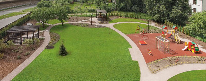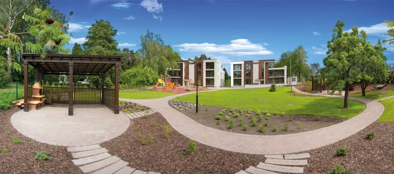 Проект объединяет удобства жизни в квартире со всеми преимуществами проживания в частном особняке – собственная территория огорожена забором, освещенный и благоустроенный сад, лужайка, беседки c садовой мебелью и грилем, удобные скамейки, клумбы, цветы и чудесная детская площадка.